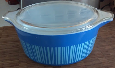 I was beyond thrilled. I love it. I looked it up to see the pattern and it is a rare item they made as a promotional piece in 1966. The pattern is called by two names, either blue stripe or blue barcode. That is so awesome. And to think it was vintage 1966, the year my baby brother was born. I put it in a place of honor on top the baker's rack.