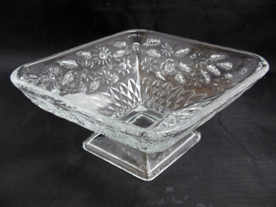 I just love vintage candy dishes. The beautiful designs. The cut glass, the etched glass. I use some for candy but some just to set around. My favorite two are on my coffee table. I bought this one for the unique diamond shape.